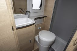 A côté du lit, le Siena 330 fait logiquement la part belle à une intéressante salle d'eau, s'étirant elle aussi dans la longueur. Si elle se montre classique dans son agencement, elle n'en reste pas moins efficace pour les utilisations quotidiennes, puisque la douche est notamment séparée par des battants. Une chose intéressante pour éviter les projections d'eau vers les WC et le lavabo. Le tout est complété par plusieurs blocs de rangements, l'une des autres marques de fabrique de ce camping-car.
