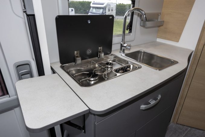 Plus en amont, on retrouve bien évidemment le traditionnel bloc cuisine, situé directement à gauche quand on entre. Plutôt bien pensé, il se révèle là aussi agréable au quotidien, notamment par une excroissance du plan de travail permettant d'effectuer, notamment, des opérations de découpe sur la partie placée juste avant le réchaud, en plus de la rallonge située à l'extrémité du bloc. Le frigo, d'une capacité de 142 L, est pour sa part installé au pied du lit, séparant ainsi la chambre du salon.