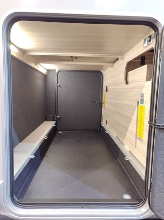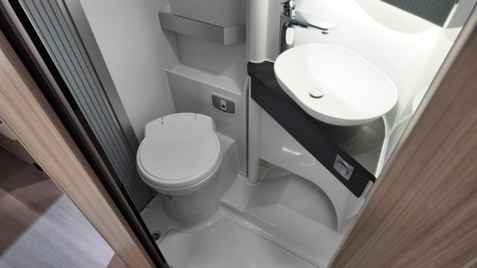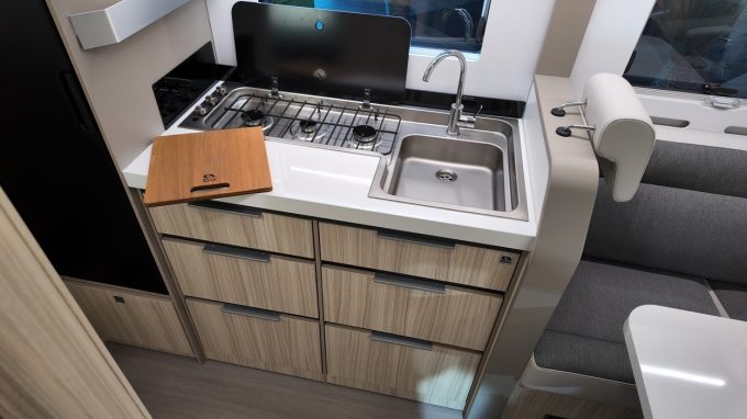 Dans la continuité de la dinette, qui peut se transformer en troisième couchage, le meuble cuisine offre la bagatelle de six espaces de rangement au niveau de sa partie inférieure. Le plan de travail est pour sa part constitué, en plus de l'évier, de trois feux et d'une zone pour effectuer certaines opérations comme la découpe de légumes. En partie haute, des meubles permettent là aussi de stocker du matériel. En face, la salle d'eau est composé d'un bac de douche, d'une paroi de douche pivotante, et, en plus des traditionnelles armoires, d'un toilette chimique à casette pivotant.