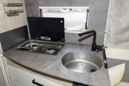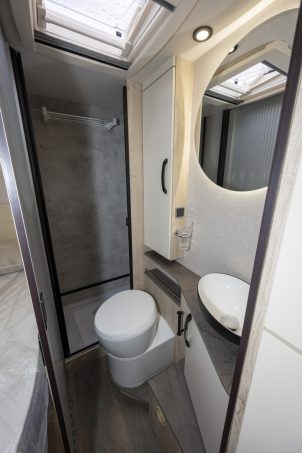 La partie arrière de ce camping-car, dont le chauffage est assuré par une solution Truma D4, est enfin consacrée à la star de ce plan : le lit à la française, qui prend place sur le flanc droit du véhicule, juste derrière l'espace dévolue au frigo à compression de 145 L. Permettant de coucher deux personnes, il est accompagné, sur le côté gauche, par la salle d'eau. Alors qu'un troisième couchage peut être envisagé grâce un lit pavillon, faisant de ce Baxter 64 LDF un véhicule homologué en quatre places carte grise et trois places couchage. Prix de ce camping-car intéressant à plus d'un titre, dont les réservoirs sont de 120 L pour les eaux propres et 119 L pour les eaux grises : à partir de 74 500 €.