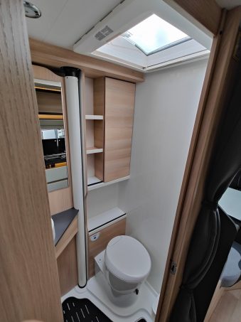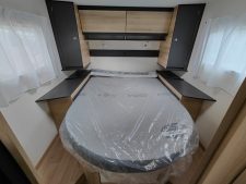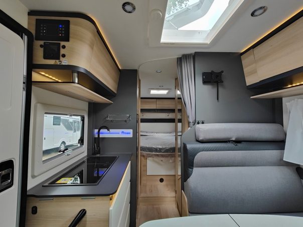Alors que la cuisine, avec un réchaud deux feux et un réfrigérateur de 128 L, prend place à l'entrée du véhicule, juste en face d'une salle d'eau faisant confiance à une paroi pivotante, dans le but de bénéficier d'une meilleure optimisation des espaces. L'arrière du véhicule est pour sa part consacré à une chambre faisant la part belle à un lit central de 140 x 190 cm, dont une option réside dans la possibilité d'ajouter huit centimètres supplémentaires en tête de lit. Pendant qu'un deuxième couchage prend place au niveau du salon le soir venu, grâce à un lit de cabine escamotable de 140 x 188 cm. De quoi envisager une utilisation familiale. Rien de plus normal pour un véhicule faisant finalement partie de la gamme "Famili Compact" du constructeur mayennais !