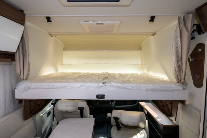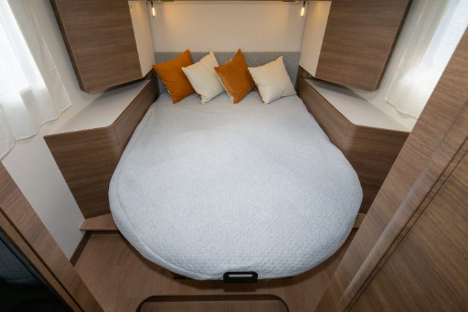 Notre tour du propriétaire commence donc logiquement par la chambre, en partie arrière de ce camping-car développé sur châssis Fiat. L'occasion de noter des choses bien faites, à l'image des rangements, nombreux, ainsi que de l'éclairage, parfaitement soigné. Mais aussi et surtout de souligner la présence d'un sommier rétractable, accompagné d'un réglage de la hauteur de soute, même si ce dernier est en option. Une nouvelle fois, Rapido allie donc belle qualité d'exécution et praticité du quotidien.