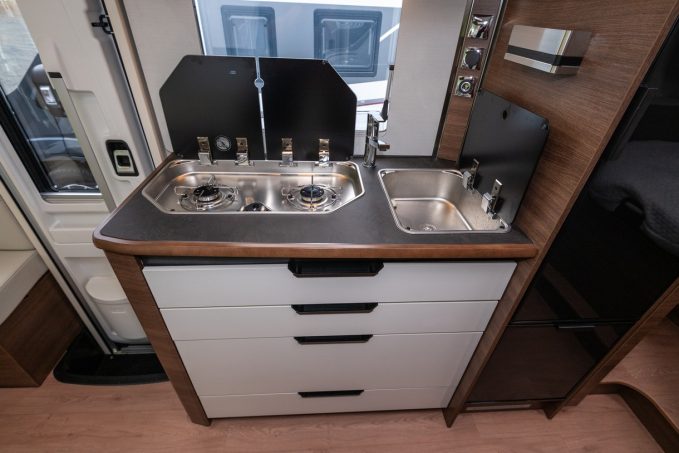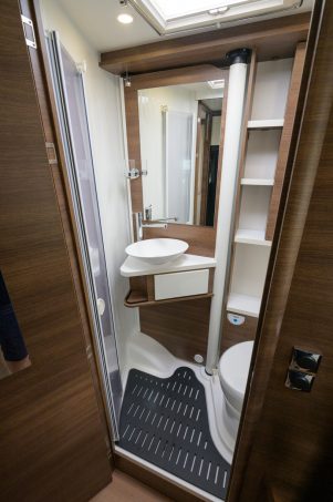 En option, le salon peut d'ailleurs être converti en lit de dinette. Alors qu'un second couchage, en plus du lit central, prend place au niveau de la cabine. A côté, la cuisine, située directement à gauche quand nous rentrons, propose un évier ainsi qu'un réchaud gaz deux feux. Dans la continuité, un frigo de 135 L est de la partie. Pendant qu'en face, la salle d'eau fait confiance au système Duo'Space, dans le but d'optimiser les espaces. Le 850 F se révèle donc dans les faits être un intégral compact et maniable, tout en s'appuyant sur une implantation bien pensée. Un camping-car affiché à partir de 83 360 €.