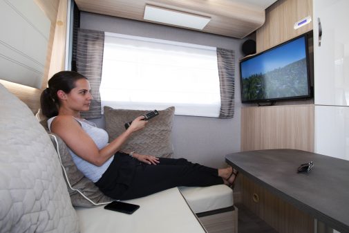 Le salon aménagé à l'arrière se présente comme un espace détente avec son confortable sofa en L. Celui-ci fait face à un écran de télévision de 32 pouces (avec lecteur DVD) connecté à une installation audio Bluetooth (option home-cinéma avec ampli et haut-parleurs Focal à 590 €).