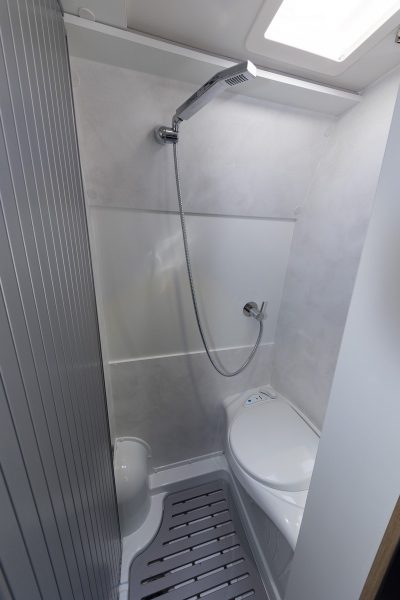 Face à cette cuisine, on retrouve la salle d'eau qui profite des évolutions apportées l’an passé sur le modèle classique. Les ingénieurs ont en effet abandonné la salle d’eau transversale avec douche au centre du couloir, pour revenir à un format plus étriqué certes, mais faisant preuve de plus de modularité. Ainsi, le lavabo se rabat désormais dans la paroi -libérant de l’espace au profit de la douche ou du WC- et n'oublions pas de mentionner les astucieuses niches de rangement intégrées directement dans la paroi.