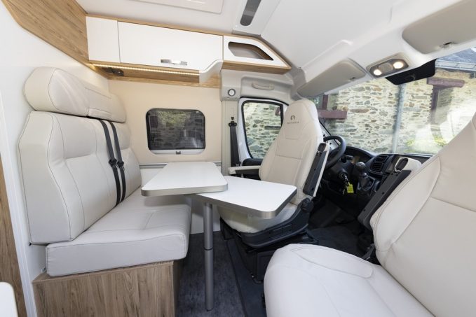 L'habitacle de ce K540 G dévoile une ambiance lumineuse et surtout flatteuse. La découpe de cabine est prévue de série et offre ainsi un joli sentiment d'espace pour les occupants du salon. Ce dernier peut recevoir 4 personnes, réparties sur la banquette face route et les sièges pivotants de la cabine. Le plateau de table paraît sous-dimensionné, mais c'est sans compter sur une rallonge pivotante utile. Pour contenter ses convives d'un bon repas, ce K540 G dispose à l'entrée d'une cuisine. Elle n'affiche pas des dimensions démesurées, vous vous en doutez bien, mais elle se montre en revanche plutôt fonctionnelle à l'usage. Rangements cohérents, frigo à compression en partie basse, combiné réchaud/évier ou encore tablette escamotable faisant office de plan de travail... rien ne manque.