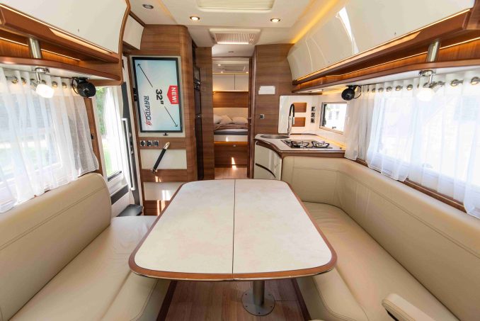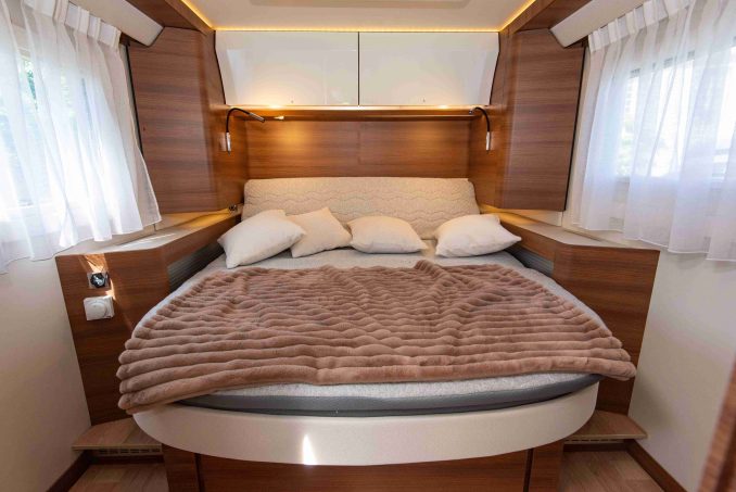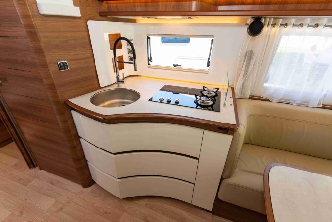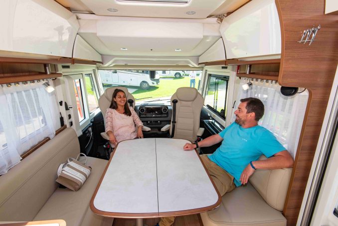 Les plans correspondent parfaitement aux attentes des camping-caristes français. Un joli salon avec des banquettes latérales en vis-à-vis et de confortables sièges de cabine montés sur embase pivotante, une belle cuisine en L faisant face à une tour intégrant un grand frigo, une salle d’eau en deux compartiments distincts mais réunissables et une grande chambre avec un lit central ou lits jumeaux.