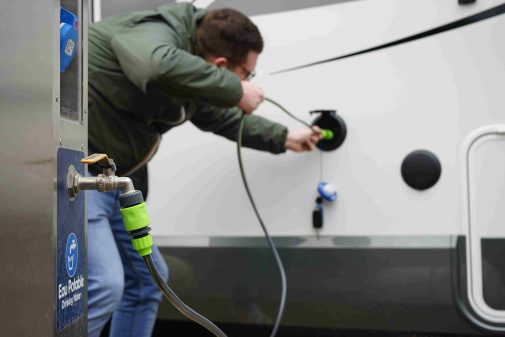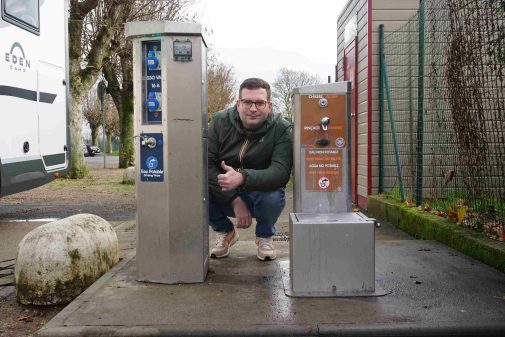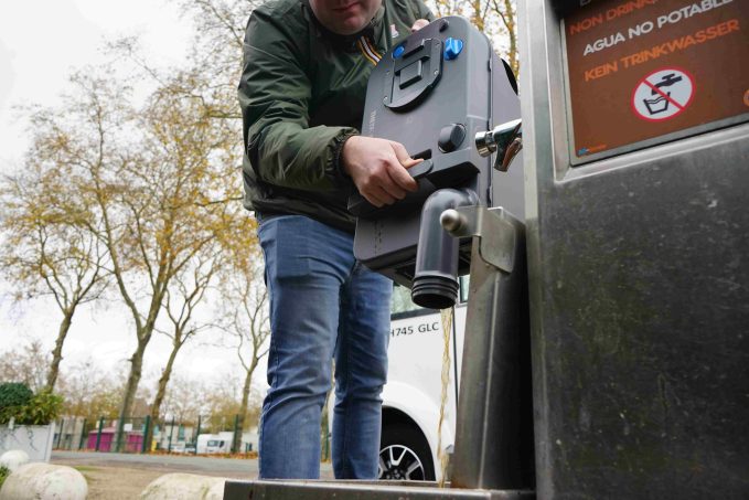 Pour faire le plein du réservoir d’eau claire, vous devrez impérativement vous équiper d’un tuyau et de plusieurs embouts pour vous raccorder aux robinets. Car il n’existe pas, hélas !, de système universel. En vous rendant dans une jardinerie ou un magasin de bricolage, vous trouverez tous types d’embouts et de tuyaux. Un conseil : choisissez-en un qui se vide lorsque vous l’enroulez. Vous éviterez de vous retrouver avec quelques litres d’eau qui pourraient se déverser dans la soute. L’inconvénient de ce type de tuyau est qu’il faut le dérouler complètement pour l’utiliser. L’avantage, outre le fait qu’il ne déverse pas d’eau quand on le range, est qu’il est peu encombrant. Lorsqu’on remplit le réservoir, la pression ne doit pas être trop forte. Sinon le système d’évent dysfonctionne et le liquide refoulera. Pour supprimer ce phénomène, les accessoiristes vendent un bouchon avec embout type “Gardena”, pas cher et très pratique. Dernier petit conseil concernant le plein d’eau : n’oubliez pas de remette en place le bouchon de remplissage avant de quitter l’aire. Nombreux sont les camping-caristes qui le laissent sur le bord d’un muret. Placer un autocollant pense-bête à hauteur d’œil, au-dessus de l’orifice de remplissage, est une méthode comme une autre pour éviter cet oubli.