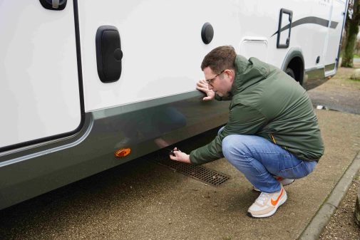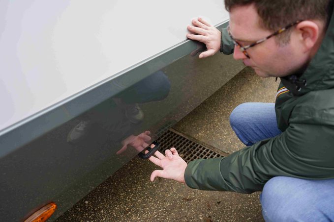 Vidangez les eaux grises en actionnant la manette qui se trouve souvent sous le véhicule. Souvent placée assez bas, sous le plancher du véhicule, il faut se baisser, voire s’agenouiller. Les personnes souffrant du dos auront donc intérêt à s’y prendre prudemment. On peut aussi envisager d’installer un petit tapis au sol pour ne pas salir son pantalon. Enfiler des gants avant de manipuler la vanne est aussi une bonne idée, surtout par temps de pluie quand la manette risque d’être salie par les projections de boue. Laissez s’évacuer les eaux grises jusqu’à la dernière goutte (cela peut prendre 5 mn pour un réservoir de 100 l). Au terme de l’opération, refermez impérativement la vanne. Il est toujours désagréable de voir un camping-cariste repartir avec le réservoir ouvert, laissant derrière lui des résidus d’eaux sales. Certaines aires n’ont pas été bien conçues (oui, ça existe) et la grille de dépotage mal positionnée. Il faut alors brancher une rallonge de tuyau annelé sur le tube d’évacuation. Certains constructeurs livrent ce tuyau avec le véhicule. Mais très souvent, il s’agit d’un accessoire optionnel, heureusement bon marché, ou que l’on peut fabriquer soi-même.