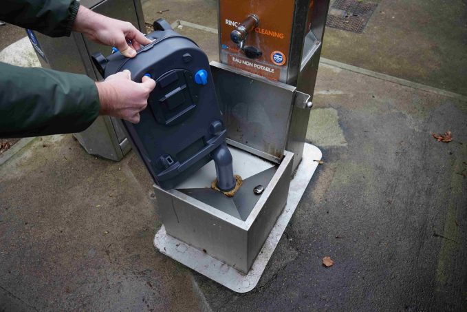 Après les eaux grises, passons à la vidange des eaux noires (il n’y a pas d’ordre), les matières contenues dans la cassette des WC. L’opération est peu ragoûtante, nous l’avouons, mais les constructeurs de ces réservoirs ont tout fait pour éviter de se salir les mains. On vous conseille malgré tout de porter des gants. On vide la cassette dans le bac prévu à cet effet. On le reconnaît facilement, car il est souvent équipé d’un couvercle ou d’un clapet. La cassette est munie d’un évent (un bouton souvent de couleur jaune) sur lequel il faut appuyer lorsque vous basculez le réservoir. Si vous ne le faites pas, l’écoulement se fera mal et vous risquez des éclaboussures. Une fois la cassette vidangée, il faut la rincer uniquement en employant un bout de tuyau personnel branché sur l’arrivée d’eau de la borne. Certaines bornes sont équipées d’un robinet spécialement destiné à cet usage.