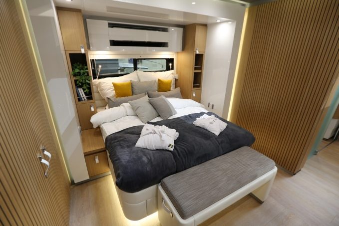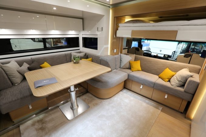 Entre le salon et la chambre, on trouve la salle d’eau composée d’une large douche, d’un wc et d’un grand lavabo encadré de rangements. Toute la partie avant du véhicule est occupée par le salon et la cuisine. Cette dernière est disposée dans la longueur et est entièrement équipée (plaque de cuisson, un four, hotte, évier…). Le grand réfrigérateur est, quant à lui, situé de l’autre côté, à gauche du grand canapé. Enfin, au-dessus de la cabine de pilotage, on trouve un lit de pavillon double.