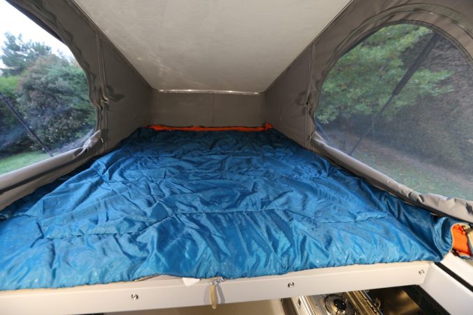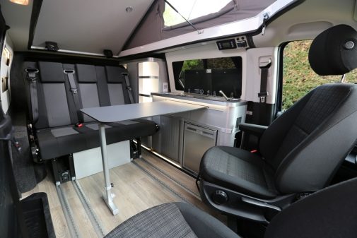 Au niveau du salon, la banquette route 3 places et les sièges cabine sur embases pivotantes forment le coin repas. Ce dernier s’agrémente d’une table plaquée astucieusement derrière le dossier de la banquette. Le pied se déplie et le plateau vient prendre appui contre la kitchenette. L’accueil nocturne est assuré par la présence de deux lits double. Le premier est présent dans le toit relevable et affiche des dimensions de 123/108 x 197 cm avec une hauteur en pied de 42 cm. Pour plus de confort, peut-être le second couchage vous conviendra mieux en convertissant la banquette du salon (110 x 190 cm).