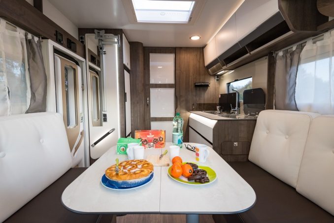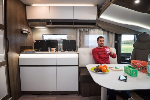 Mais ce qui est frappant lorsque vous pénétrez dans l’habitacle, c’est la place octroyée à la partie cuisine. Cet Amphitryon offre à ce poste culinaire de véritables propriétés domestiques. On retrouve donc un réchaud 3 feux en lignes surmonté d’une hotte aspirante, d’une cuve inox agrémentée d’une robinetterie avec douchette extractible ou encore d’un réfrigérateur de 141 l avec freezer intégré et tiroir à bouteilles indépendant.