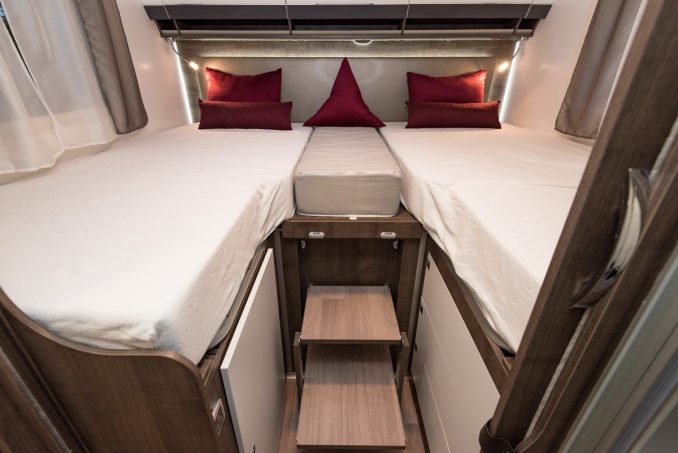 • Sous les lits jumeaux une grande soute garage. © Camping-car Magazine