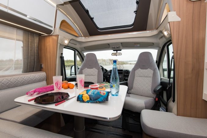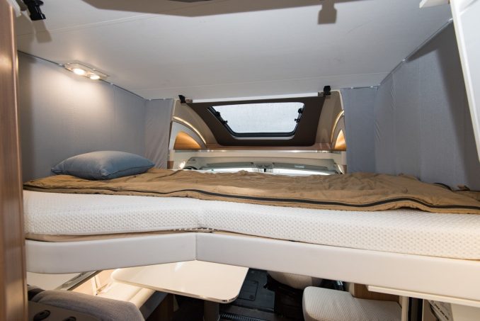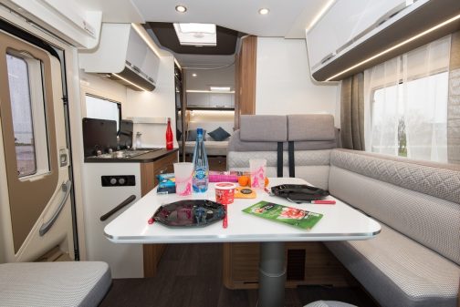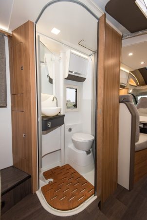 Une fois à bord, il est difficile de ne pas souligner l’atmosphère moderne qui se dégage de cet Axess, où se mêlent harmonieusement mobilier clair et tissu flatteur. Adria démontre ici le beau travail mené sur cette série d'accès en matière d’ambiance. Le salon se distingue par son caractère "classique" voire désuet au regard du marché. Dans ce 600 SC, point de salon tendance face-face. Adria reste fidèle aux assises dans le sens de la marche avec un retour en L, et ça fonctionne bien. Le coin repas s’accompagne des sièges à embases pivotantes ainsi que d’un sofa latéral plus confortable comme repose-pied que comme assise. Toutefois, il permet à la marque de revendiquer une dînette pour 5 personnes. Cet Axess opte pour un lit central (148 x 192 cm) complété de série par un lit de pavillon de 120/102 x 184 cm. Quant au poste sanitaire, Adria optimise l'espace en adoptant son système baptisé Duplex qui consiste en une cloison pivotante permettant de passer d’un espace WC (avec lavabo) à une vraie cabine de douche isolée.