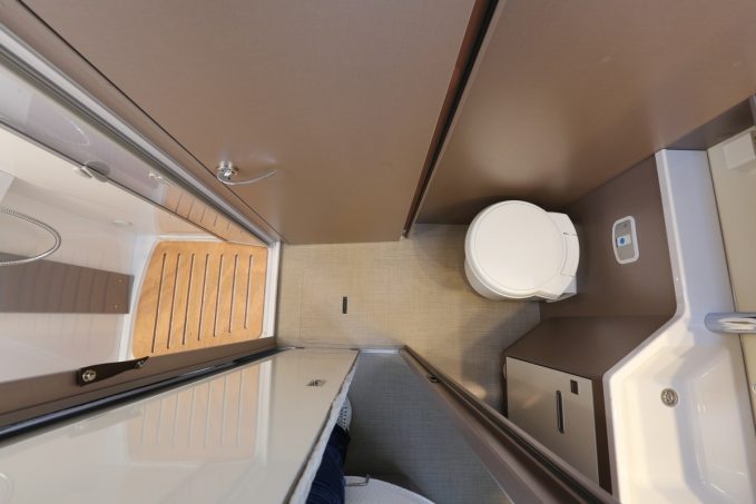 La salle d'eau en deux parties peut se réunir en une. © Camping-car Magazine