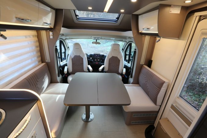 Ainsi, l'habitacle se compose d'un coin repas avec les sièges de cabine sur embases pivotantes et les assises latérales. Ces dernières affichent des dimensions de 104 cm côté conducteur, et 68 cm pour l’autre. Sur route, elles se transforment grâce à des dossiers amovibles en places homologuées avec ceinture. En partie arrière, ce Lyseo TD abrite le couchage principal, un lit central de 142 x 186 cm. D’un point de vue tarif, ce Lyseo TD 732 est commercialisé à partir de 57 990 € dans sa version Classic et de 59 990 € en finition Privilège.