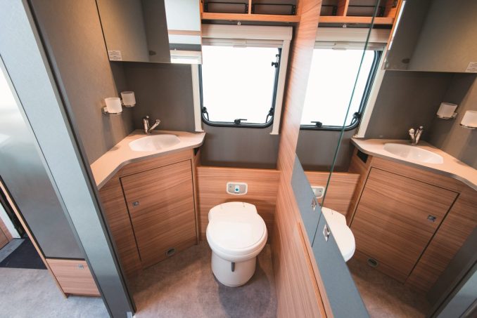 Grâce à cette implantation sans lit permanent, ce profilé est le seul de la série à disposer d'une salle d’eau aussi vaste. Ce T6762 propose donc sur toute sa zone arrière, un grand cabinet de toilette avec une douche séparée très spacieuse. De plus, une grande baie opaque assure une excellente luminosité naturelle tout en assurant une aération optimale. Pour les rangements, ce profilé reçoit également un grand dressing comprenant 9 rangements malheureusement ouverts.