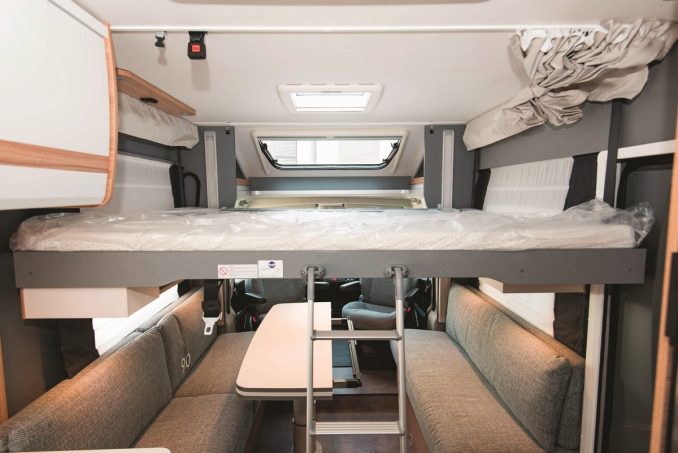 Après avoir écourté la commercialisation d’une implantation sans lit au sol, Dethleffs la remet en lumière. Et face à la concurrence sur ce secteur, le constructeur allemand propose ce type d’agencement dans son entrée de gamme Just, l’objectif étant de séduire par un prix attractif (58 410 €). En plus de cet argument, l’inédit T6762 affiche une bonne maîtrise de l’habitacle. Mention spéciale au salon avec des banquettes de 130 cm (côté passager) et 170 cm (côté conducteur). Ces assises sont agrémentées d’un vaste plateau de table de 110 x 86 cm, rabattable par moitié pour libérer un bel espace de circulation.