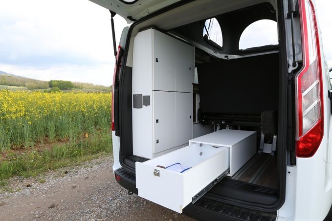 Le Laika Kosmo Urban peut être utilisable au quotidien avec une homologation pouvant atteindre 6 personnes. Pour autant, il est parfaitement équipé pour pratiquer du loisir avec tout l'aménagement nécessaire. On retrouve en effet un couchage double en pavillon reposant sur un sommier à assiettes indépendantes, gage d'un confort optimal. Ce lit est secondé par une banquette facilement convertible. Seul bémol, sa largeur inférieure à 1 m. L'ameublement le long du véhicule reçoit un combiné réchaud et évier ainsi qu'un frigo de 41 l à compression. De multiples rangements viennent également en complément. Dans le hayon, une table est habilement rangée dans un étui prévu à cet effet. Elle peut être utilisée à l'intérieur, en appui sur le meuble cuisine, ou en extérieur grâce à des pieds rétractables.