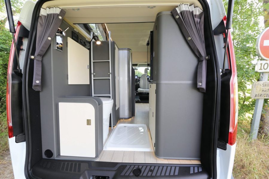 Tout comme les modèles Volkswagen et Mercedes, le Kesley est équipé d’un toit relevable dont l’articulation est placée à l’avant. Sa partie la plus haute, une fois la “casquette” relevée, se situe donc à l’arrière, là où se trouve le receveur de douche dissimulé dans le plancher.