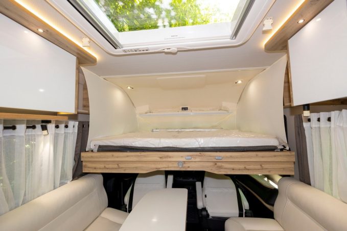 Dissimulé au-dessus de la cabine, un second grand couchage (190 x 140 cm) permet d’envisager des escapades en famille. Dans ce cas, optez pour le bloc-moteur de 180 ch et la boîte automatique à 9 rapports, deux options qui s’imposent avec un tel standing.