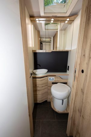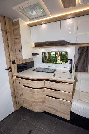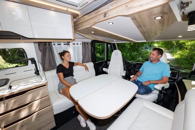 Classé en catégorie poids lourd, sa charge utile (860 kg) lui permet de transporter un deux-roues motorisé. Ce modèle nécessite un permis approprié (PL ou B79). Son châssis AL-KO représente un autre atout. Plus confortable, il autorise l’installation d’un double-plancher, gage d’une meilleure isolation et de plus de rangements. L’implantation de son salon, avec deux banquettes en vis-à-vis, confère une impression d’espace agréable, renforcée par l’utilisation de matériaux clairs.