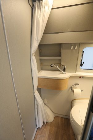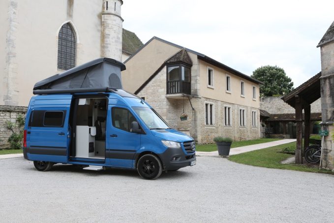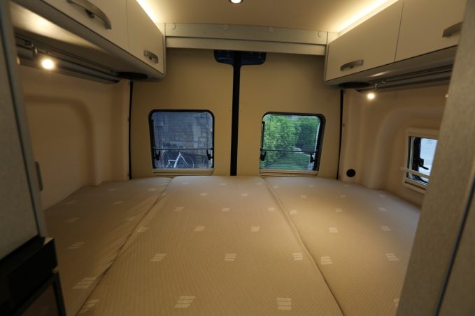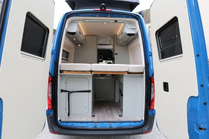 Le salon mise sur une banquette face route avec deux places homologuées. Les deux sièges avants se retournent. Il est donc possible de se retrouver à quatre autour de la table et de véritablement profiter d'un "espace salon". La cuisine offre un réchaud deux feux, un évier Inox et de nombreux rangements. La salle d'eau, petite mais fonctionnelle, présente tout de même une douche (rare dans le secteur du van). Enfin, à l'arrière, un lit transversal accueillera deux personnes. Grâce au toit relevable, deux personnes supplémentaires peuvent profiter d'un second couchage. Il est actuellement commercialisé à partir de 87 780 euros.
