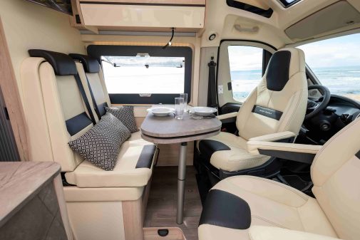 Ce fourgon de 6,36 mètres repose sur un porteur Fiat Ducato 140 ch avec boîte manuelle (ou 180 ch en option avec boîte auto). Disponible en plusieurs teintes, c’est en version noire que nous l’avons testé : une couleur inhabituelle dans l’univers du camping-car. Jantes en alliage 16 pouces, skyview de série et signature lumineuse moderne complètent ce style soigné.